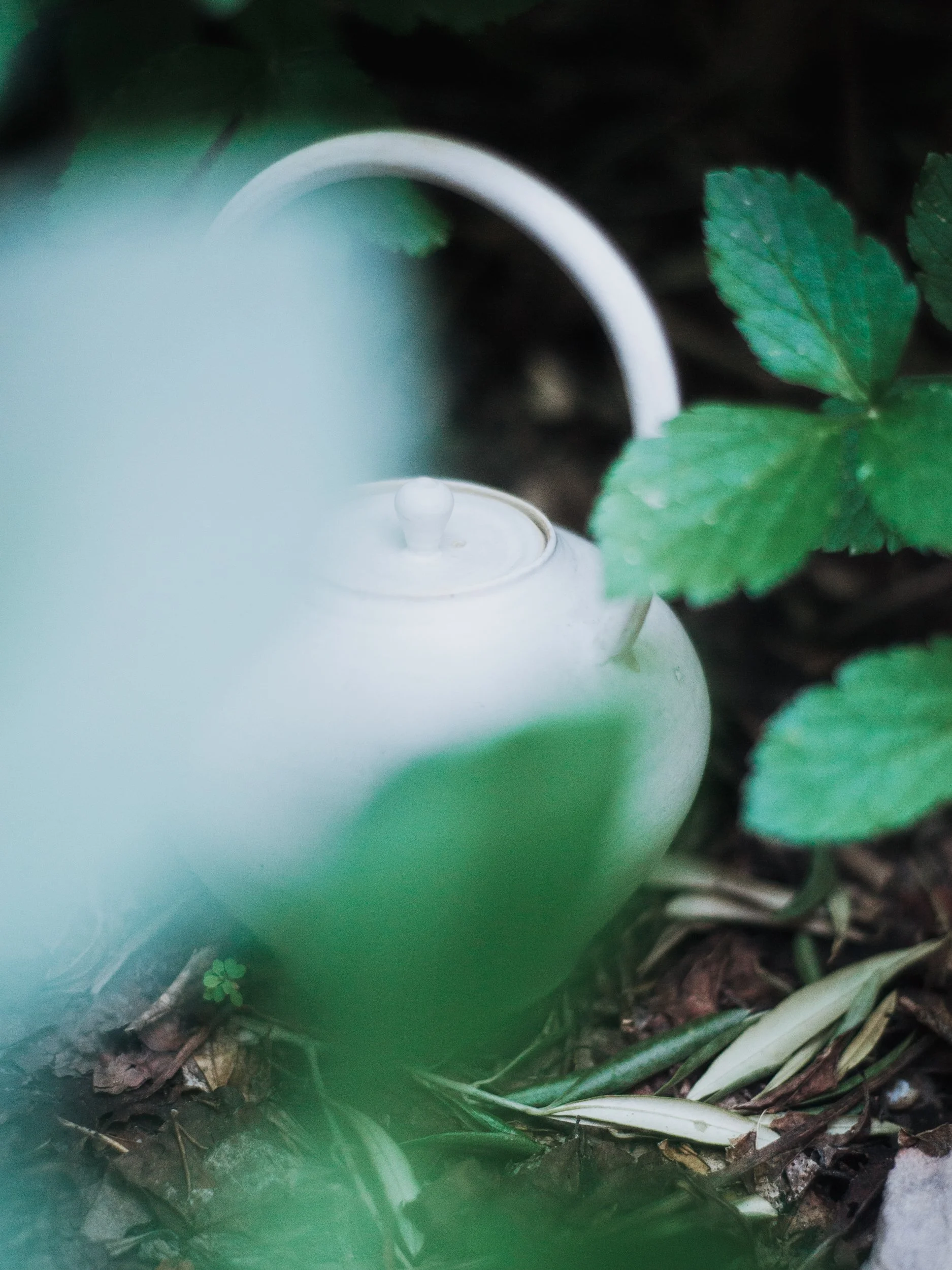 • Overhead view of a white ceramic teapot with a spout and handle
